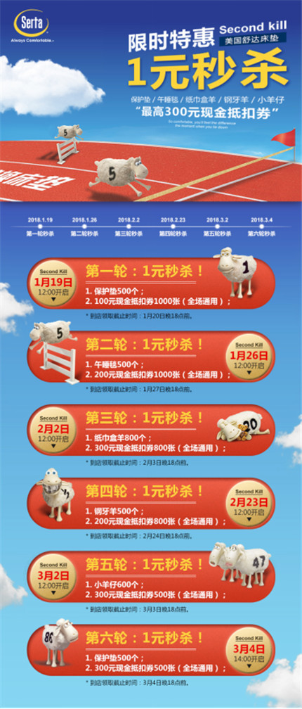 三、一元在线秒杀,1月19日开始每周五中午12点,床垫保护垫、午睡毯、舒达羊仔,还有,300元专卖店现金抵扣券!等你来抢!