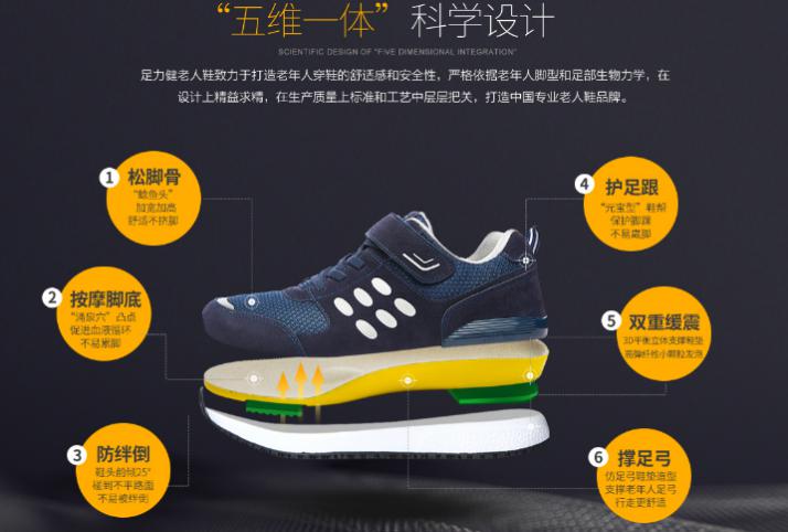 通过近几年的努力,足力健老人鞋正迅速成为老人鞋市场中的领军品牌——不仅销量持续攀升,同时还取得了24项行业设计专利和健康中国“消费者信赖的老人鞋品牌“、北京卫视《养生堂》 栏目推荐品牌、2017中国鞋业盛典“最佳老人鞋”、“鞋业新零售创新品牌”等多项荣誉。