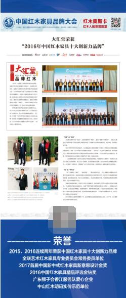 在现场领导、专家、名企的共同见证下,大汇堂红木厂荣膺“2015年中国红木家具十大创新力品牌”