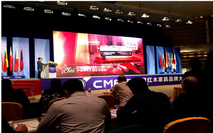 中山大汇堂红木家具批发市红木家具场荣获“2015中国红木家具十大创新力品牌”,总经理胡春龙(左二)上台接受颁奖