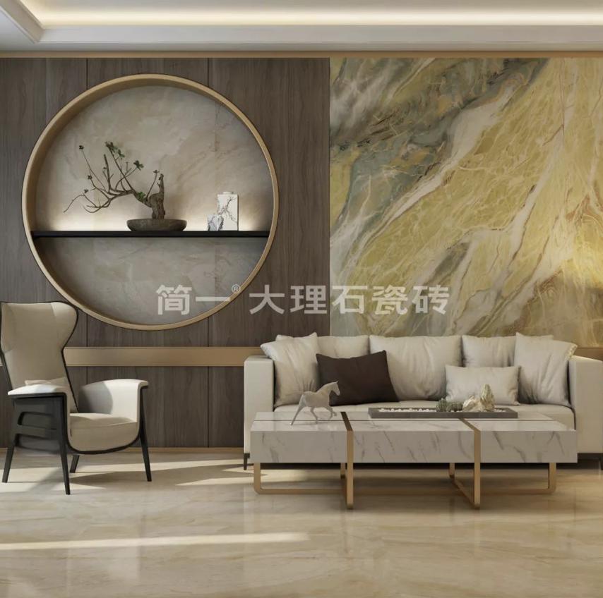 大理石瓷砖与原木、金属元素的搭配展示,地面采用了简一独有的密缝铺贴技术,缝隙可控制在0.5mm 以内,可以有效地实现大理石瓷砖铺贴效果如自然般浑然天成的一体感。