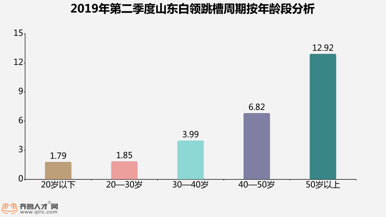 根据齐鲁人才网调查数据显示,20岁以下的员工平均跳槽周期为1.79年,20—30岁年龄段的员工平均跳槽周期为1.85年,30—40岁的员工平均将近4年才换一次工作,整体呈现出年龄越大跳槽周期越长的趋势。这其中不乏年龄成本与机会成本的加持,越是年轻的劳动者,其发展空间、学习能力都更为宽阔,定力与耐心也更为,,对待工作的态度大多是但凡不顺心就要辞职,工作观和价值观都还处于不稳定的状态,因此跳槽周期短;而年龄大的员工由于追求稳定、再就职机会,、面临退休等因素不敢轻易跳槽,这也就是为什么50岁以上的职工跳槽周期能长达13年之久。