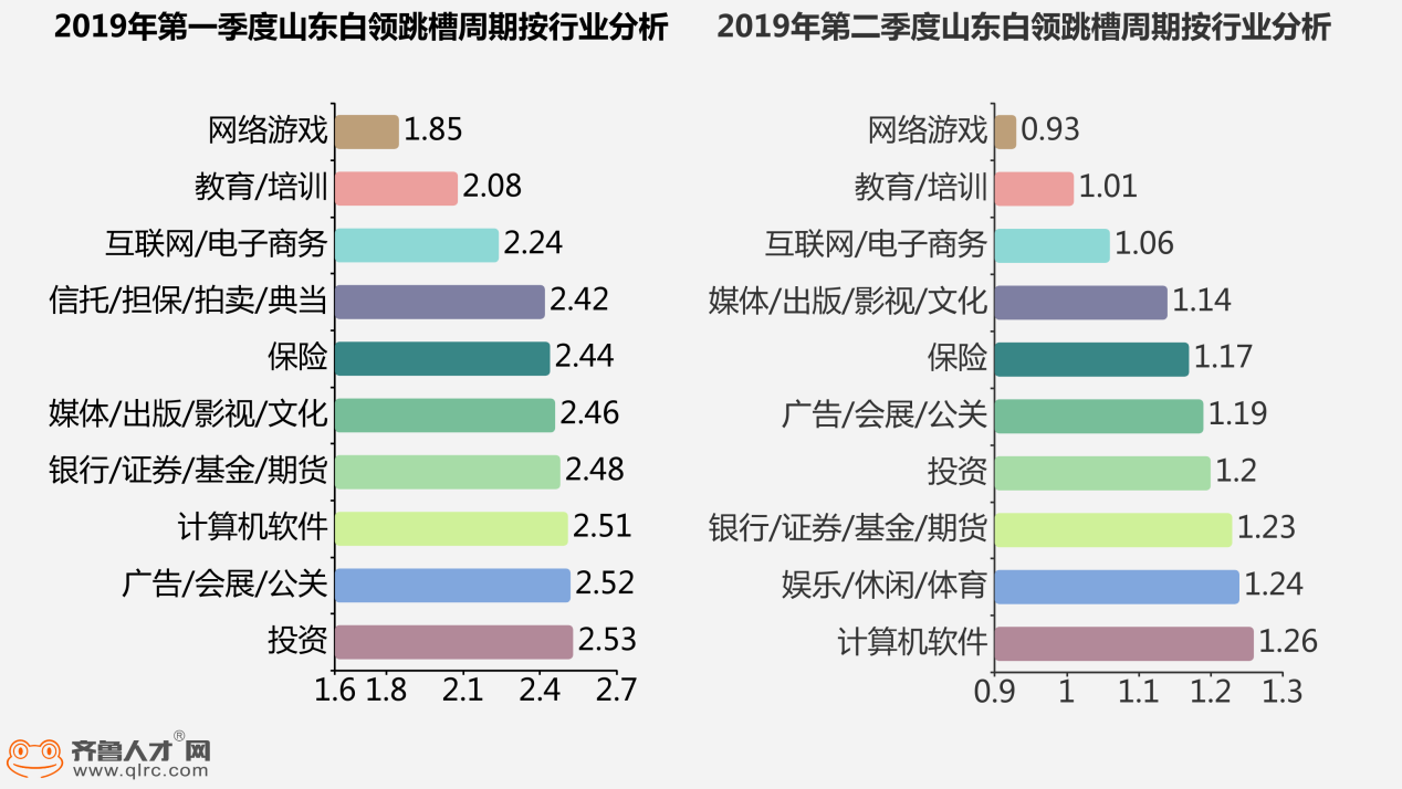 2019年第二季度山东白领跳槽周期按行业分析,互联网行业仍是跳槽重灾区