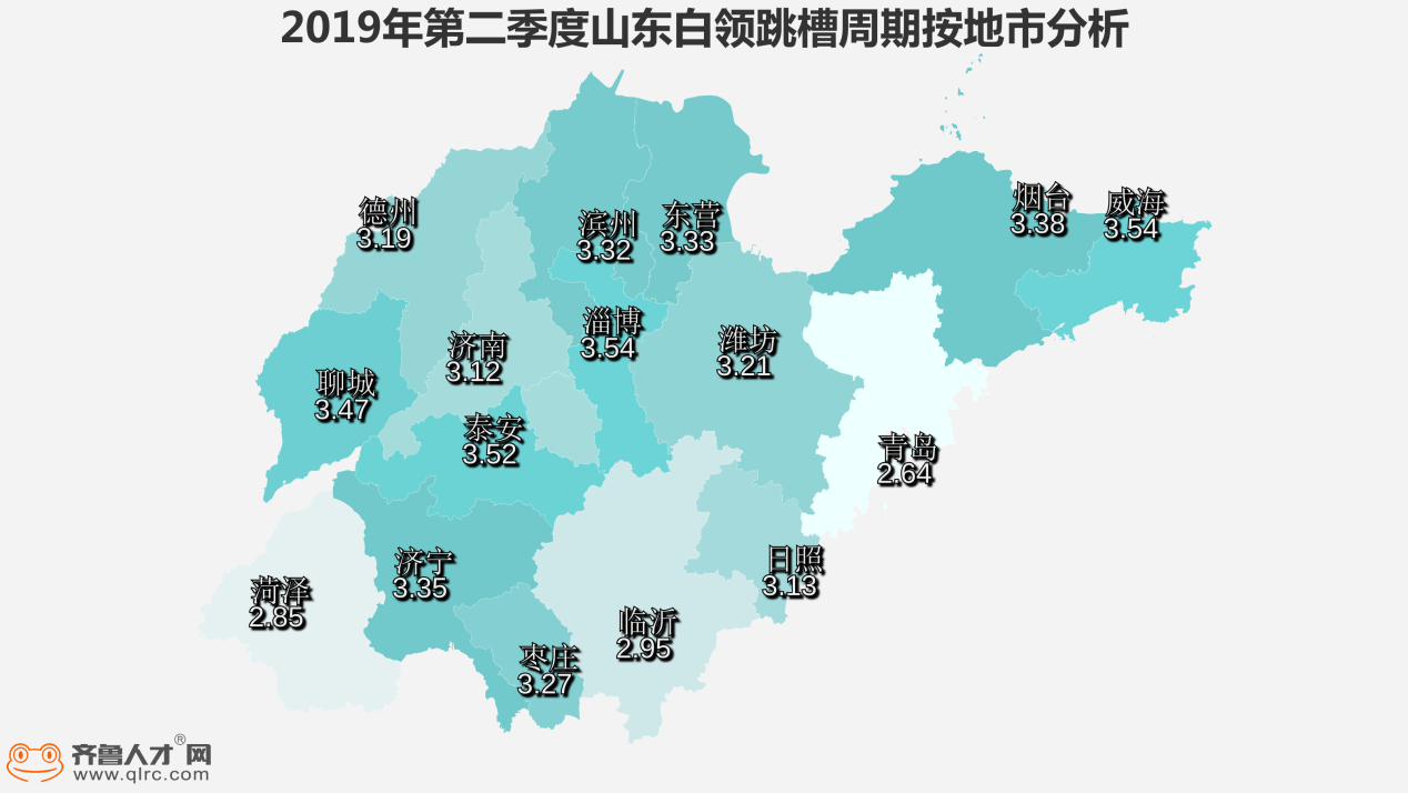2019年第二季度山东白领跳槽周期按地市分析,青岛菏泽临沂均在3年以下