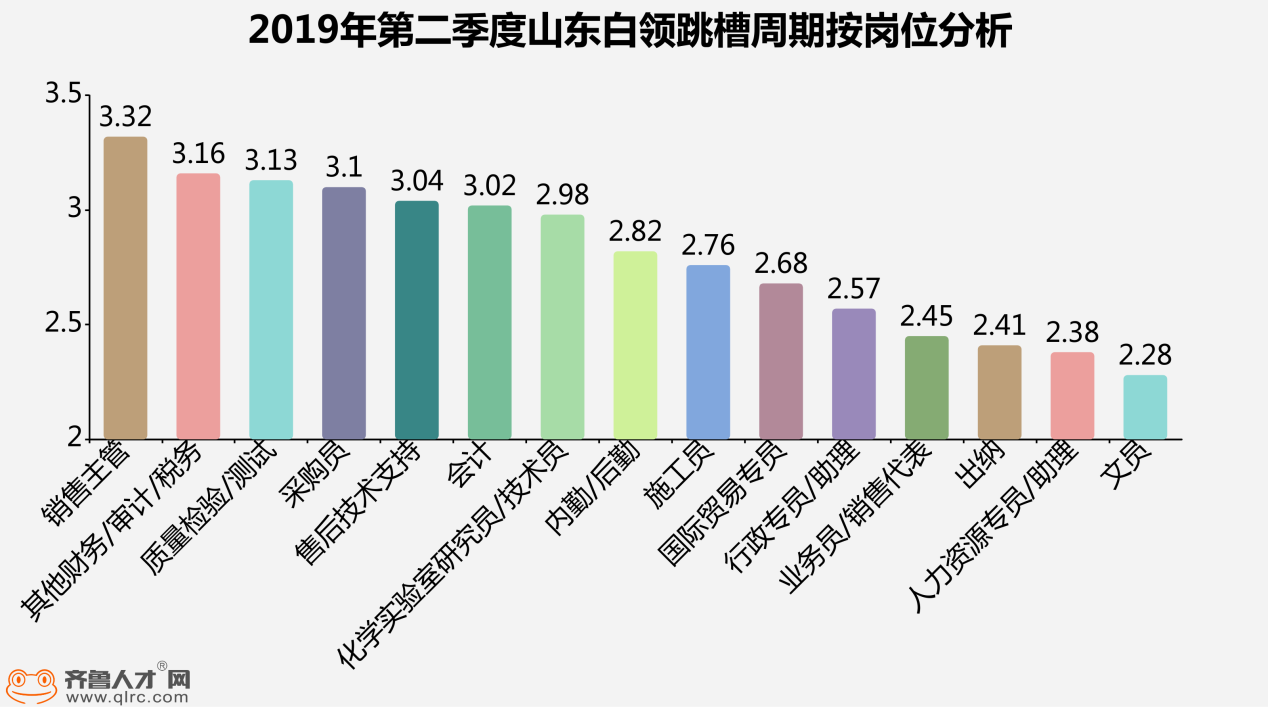 2019年第二季度山东白领跳槽周期按岗位分析,文员岗位跳槽率,