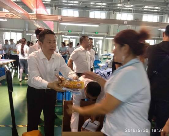 “节日慰问车间职工”。2018年9月30日,周海江一行亲自给新疆红豆服装所有车间职工发放了节日慰问品,并给予大家节日的祝福。车间职工非常高兴,感谢集团领导的关心。