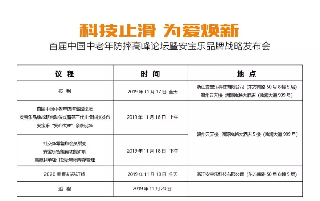 11月18日,安宝乐即将在温州云天楼.洲际瓯越大酒店举行“首届中国中老年防摔高峰论坛暨安宝乐品牌战略发布会”, 大会由中国老龄委作为指导单位,温州市民政局、中国抗衰老促进会创新与应用分会、温州市创业投资协会、温州市高教园区作为主办单位,浙江安宝乐科技有限公司作为承办单位。