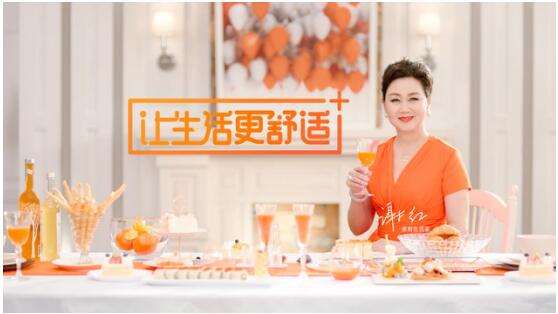 广告片中满目铺开的橙黄基调与白色家居环境相得益彰,身着橙色家居服的谢红流连于橙、黄、白交错的空间中,享受着精美生活带来的惬意与幸福,优雅的笑意,恬淡的模样,自有一番其乐融融的幸福。