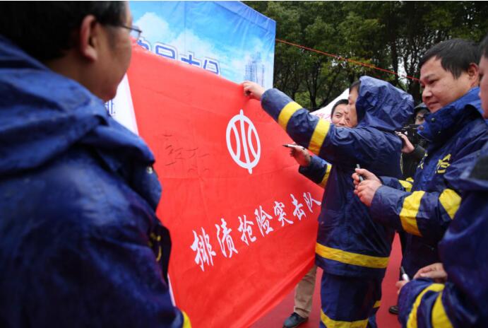 接下来的签字承诺仪式将活动推到高潮,排渍突击队各班组长依次上台,在象征着排水队的旗帜上郑重签下自己的名字,“我们代表全体队员宣誓,积极作为,服务人民!”大家铿锵有力的声音穿过雨幕,回荡在每一位在场人员的耳边。