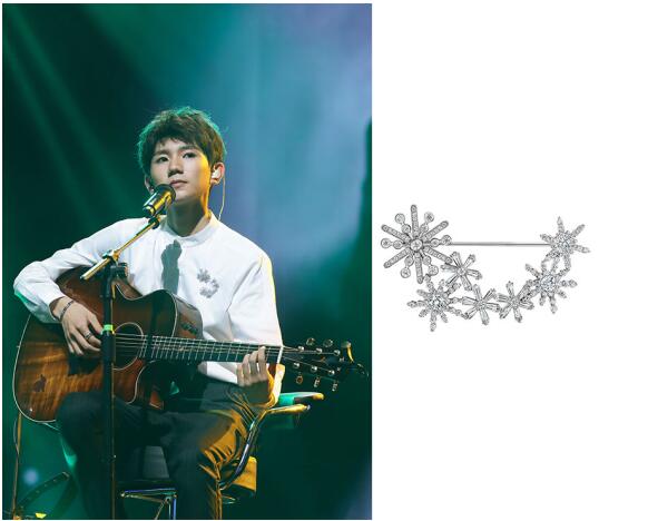 当前最红组合TFBOYS中的王源该是小小鲜肉了。不过虽然年纪轻轻,王源和资深男神们却有着同样的好品味。他在TFBOYS四周年演唱会中就充满巧思地叠戴了HEFANG Jewelry(何方珠宝)雪花系列的碎雪胸针及雪花胸针,与他清新文艺的风格外形相得益彰,也表现出了王源独树一帜的时尚感。
