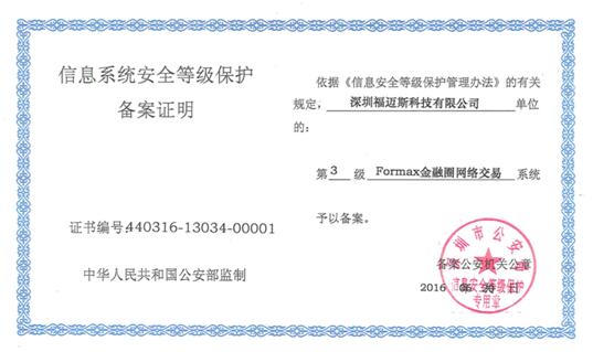 如果我们从运营时间(稳定运营超过三年)、投资规模(投资规模超100亿)、三级监管认证(是否拥有牌照)等角度筛选,目前能够达到上述要求的平台不超过20%甚至更低(2017年5月份满足上诉标准的平台数量不到10%)。作为网贷行业合规的运营企业,早在2016年7月Formax金融圈就获得了公安部颁发的信息系统安全三级保护备案证明。基于公司强大的技术能力,Formax金融圈,申请安全认证就顺利通过测评获得备案证明,意味着公司的信息技术安全系统得到官方和专业机构的认可。成为网贷行业中较少拥有三级安全认证的企业之一。