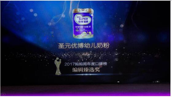 1月30日,妈妈网2018星光大赏在北京隆重举行。盛典上,2017妈妈网母婴品牌口碑榜震撼揭晓,国内知名乳企圣元荣耀上榜,旗下、明星产品——法版优博瑞慕婴幼儿配方奶粉斩获“编辑甄选奖”,获得了在场乳业嘉宾的热烈祝贺。