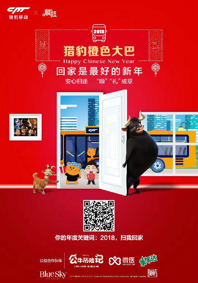 今年有了猎豹橙色大巴能够暖心助力,为许多游子的心头增添了一股暖流,大家捎着顺逛的年货,看着《公牛历险记》的电影,拿着微医的暖心礼品,喝着美年达的饮品,乘着猎豹橙色大巴,顺顺利利的回家与家人过一个暖心年。