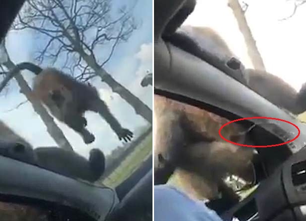 视频中,可以看到这只“厚脸皮”的猴子慢慢爬上挡风玻璃和车窗,当时窗户只打开了约几厘米,于是这只毛茸茸的猴子沿着车窗上的缝隙往车里撒尿,一位倒霉的女士被猴子尿浇了一身。只听见她大声尖叫,“猴子在我身上撒尿!啊!谁来帮帮我?” 但当时这位女士被困在座位上无法出来。