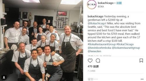 Boka餐厅宣布,这位来自西雅图的顾客消费759美元后,留下2000美元小费。