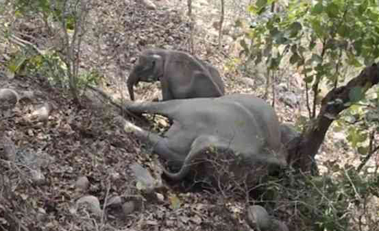据悉,这头死去的母象已经40岁了。据管理员猜测,它可能是因为从山丘上摔下来导致脖子撞在树上受伤而死。一开始,管理员轻轻拉着小象的尾巴想让它离开,但未能成功。而后,工作人员又找来两只乖顺的大象前来帮忙将悲伤的小象拉走,这两只大象一个叫Rangeeli,另一个叫拉达(Radha),目睹此情此景,要执行这项任务,他们也是十分悲伤。