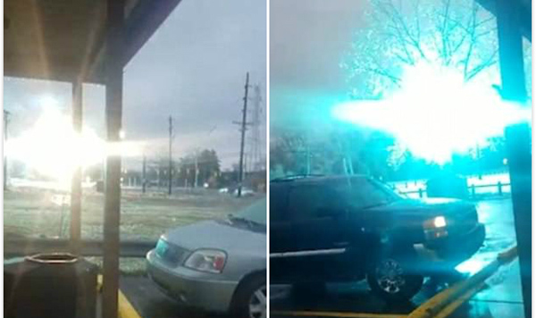 从在密歇根州伊普西兰蒂市一座加油站工作的两名男子所拍摄的视频中可以看到,道路两边的电塔上发出的电弧带着刺眼的蓝光,强烈但又断断续续,整个视频充斥着电弧低沉而又颤动的嗡嗡声。
