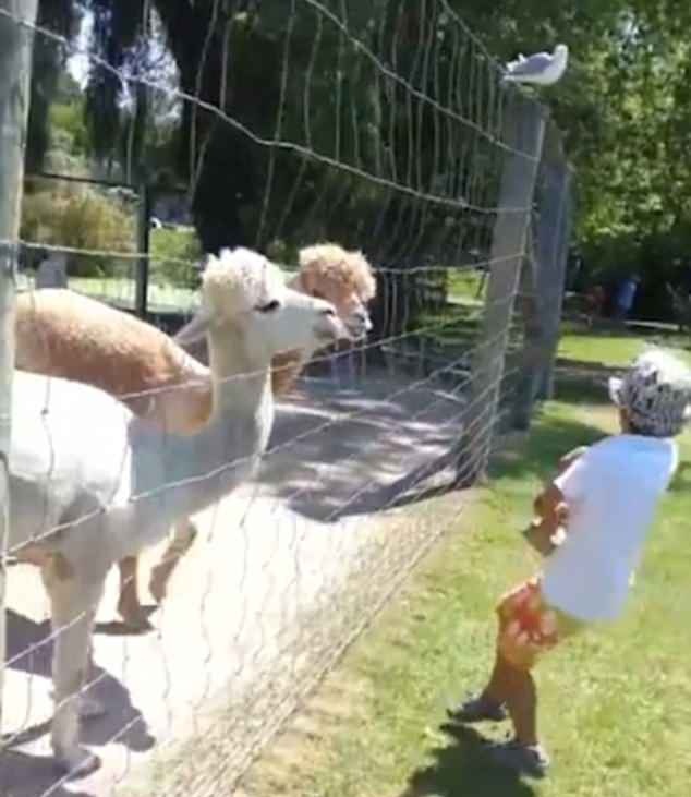 从视频中可以看到3只羊驼,两只站在围网边看着围网外侧的小男孩手中的食物,等待他喂食。没想到小男孩玩性大起,直接将食物扔过两只羊驼的头顶,被它们身后的海鸥一抢而空。其中一只羊驼在痛失了食物之后做了一个大胆的决定:只见它嘴里做咀嚼状地活动起来,然后朝前走了一小步,吐了围网外男孩一脸口水。