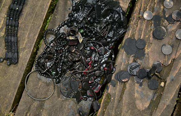 图片显示,亚当捞到的保险箱里装满了珠宝、手表、军功章和信件,虽然手表已无法使用,但胸针和军功章还可佩戴。亚当表示,他认为保险箱是被盗贼抢劫后扔进湖中的。他在附近还找到了一块较小的磁铁,所以他觉得盗贼回来找过保险箱,但因使用的磁铁吸力不够强最终没有找到。