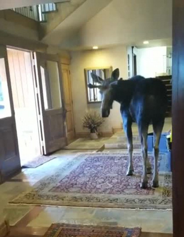 当天,雪莉(Sheri)和马特(Matt Prucka)开着前门呆在家中,随后听到家里的狗一直叫个不停,他们出来看时发现一只野生驼鹿溜达进了家里。起初,两人以为是家人们的恶作剧——以为眼前的驼鹿是他们的侄子带着动物头饰扮演的。但很快他们不得不承认眼前的这只动物的确是货真价实的野生动物。