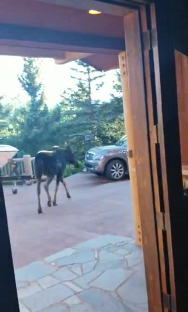 为了稳住驼鹿,雪莉把狗从房间赶出去。于是两人开始琢磨如何把这头鹿也赶走。这是一个难度不小的挑战,因为驼鹿转身时,不小心关上了身后的门,把自己关在了屋里。他们当时也没法去帮它开门。随后,雪莉迅速地从另一个出口跑到屋外,打开了前门,但驼鹿好像并不急于离开。它转过身来,站在那里看了很长一段时间,又进了厨房,在那里他停下来闻了闻柜台上的各种各样的东西。这让一家人有点担心,但它看上去很平静还很可爱。但有一段时间,当雪莉的儿子站在阳台上俯视着它时,驼鹿就立刻变得烦躁不安。