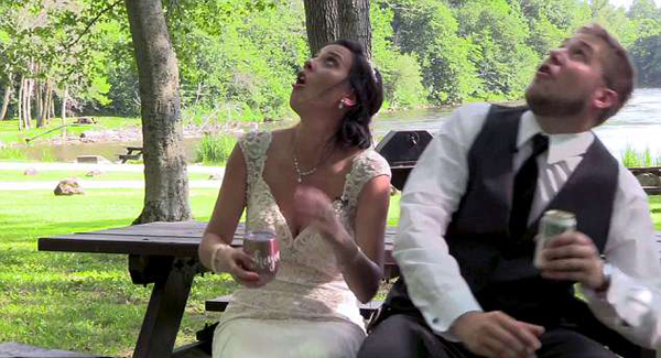 这段拍自6月30日的婚礼视频显示,事发时新婚夫妇夏安娜(Cheyenne)和卢卡斯(Lucas)正好坐在一课大树下,两人一边喝着啤酒,一边对着镜头回忆甜蜜的恋爱细节,交换对彼此的爱恋。