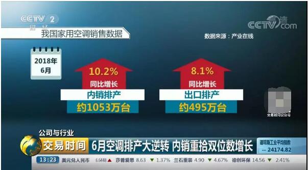 7月5日,CCTV财经频道《交易时间》栏目的“公司与行业”板块聚焦空调行业,针对中国空调企业的发展现状进行深入报道。尽管7、8月份的空调销售高峰还没结束,但各大空调企业已迎来了首轮“丰收期”,整体出货形势表现乐观。产业在线数据显示,6月空调行业整体排产约为1548万台,同比增长11.3%,其中内销排产约为1053万台,同比增长10.2%,总排产和内销排产均重拾双位数增长。
