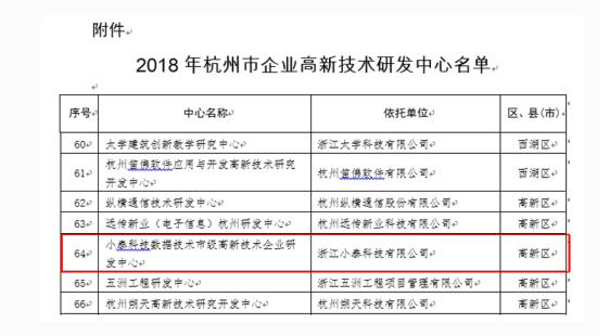 研发机构是企业技术创新体系的核心,也是企业技术进步和技术创新的主要依托。近日,根据《浙江省高新技术企业研究开发,管理办法》和《杭州市企业高新技术研究开发,管理办法》,经过各区、县(市)科技局组织现场考察、专家评审和推荐,市科委认定了279家企业研发,为2018年杭州市企业高新技术研发,。其中,小泰科技即泰然金融的研发,榜上有名。