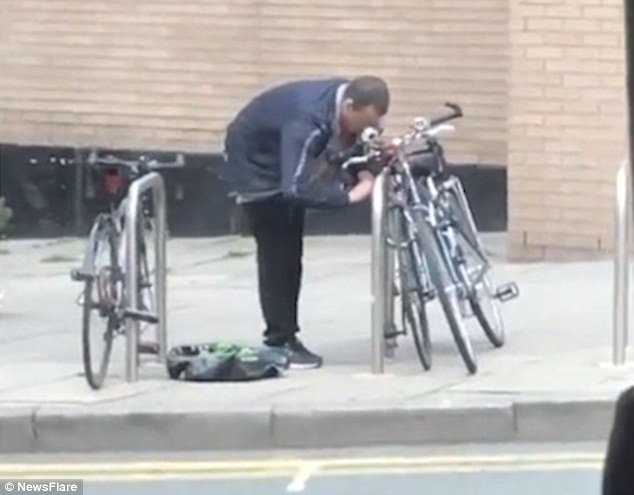 【环球网综合报道】据英国《每日邮报》8月16日报道,8月15日,在英国曼彻斯特市,一条繁忙的街道上,一名男子正疯狂地试图强行打开一辆上锁的自行车。路人不断地从他身边经过,却没有人上前阻止他。这一画面被一名在马路对面一辆公交车里的乘客拍到。