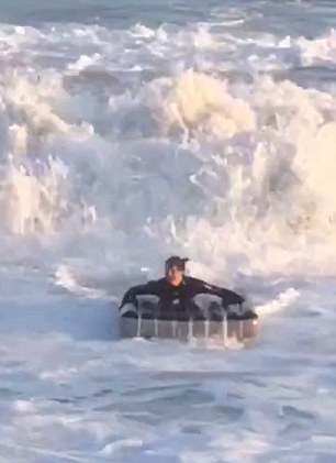 据报道,现场有人拍下了相关画面。因为紧抓充气床垫,该男子在水中显得格外突出。视频显示,大浪袭来之际,他双手紧紧抓住床垫,随后一个浪头将他推向高处又落下,甚至有一阵白色的浪花将他吞没了,看起来十分刺激。视频里人们不断惊呼“我的天哪”,又一边给他喝彩。