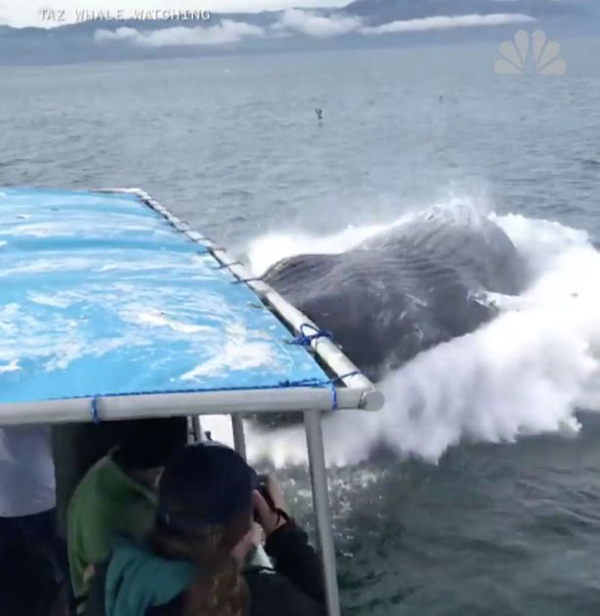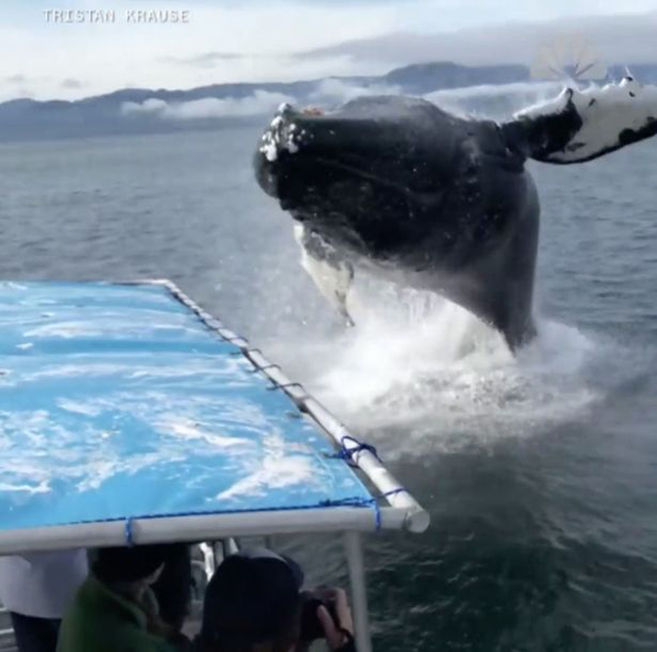 克劳斯在脸书上发布的视频显示,一艘满载乘客的观鲸游船正在海上航行。突然,一头巨型座头鲸从船的一侧跃出水面,在落入水中的一瞬间,溅了在场游客一身水。游客们也被这罕见的一幕惊呆了,他们先是激动地尖叫,后来又大笑起来。
