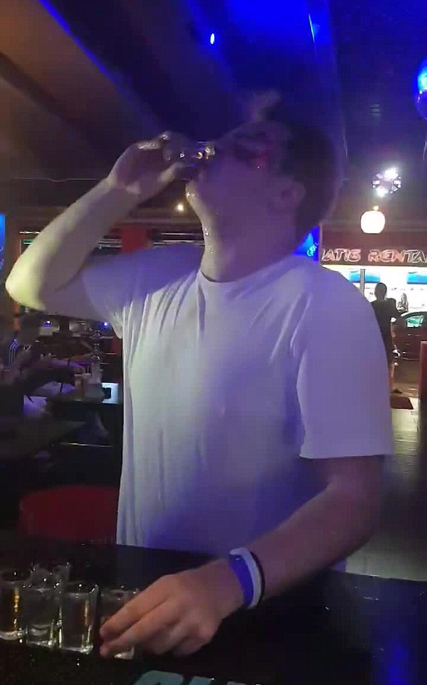 视频中的年轻男子是来自威尔士斯旺西市的克里斯•麦克亚当(Chris McAdam),今年20岁。当日,他在桑特岛一家名叫Players Sports Bar And Grill的酒吧里娱乐时,酒吧女招待告诉他:“如果你在90秒之内喝完30杯萨姆布卡(约合人民币198元),就给你免单。”于是,他接受了挑战,并开始一杯接一杯的豪饮。