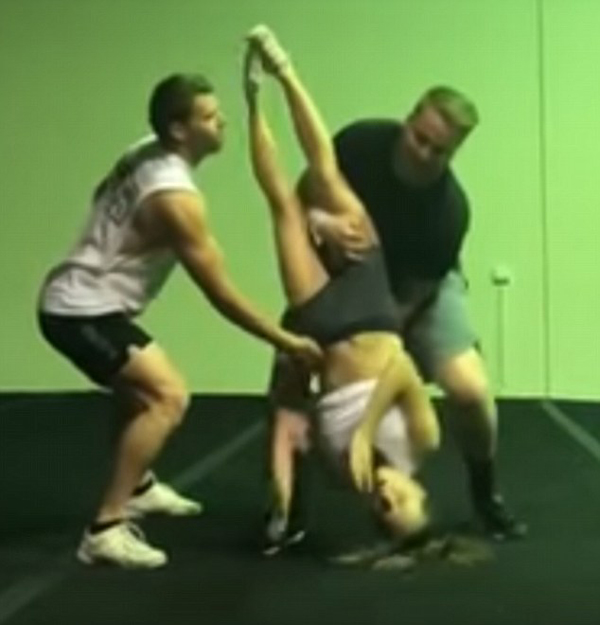 视频中的女孩被抛起,在空中进行了一个后空翻,充当底座的男子用一只手握住她的双脚,但她无法保持平衡,,开始偏移,身体向下倒去。在她的头部离地面只有几厘米时,才被观察员和他的搭档合力救起。