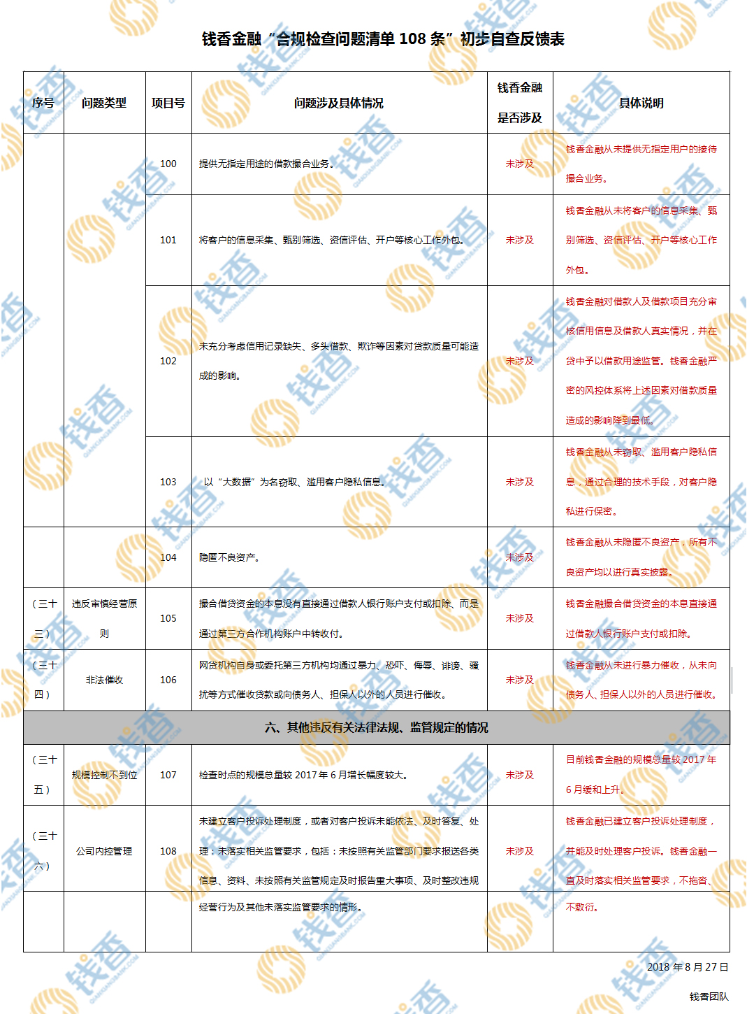 钱香金融第一时间依据《网络借贷信息中介机构合规检查问题清单》对平台的业务安全性、合规性等进行全面自查(以下简称“108条”)。
