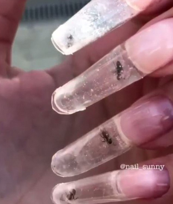 视频记录了这款创新美甲的制作过程。首先,美甲师将一片长长的透明指模贴在美甲体验者的指甲盖上,并将指模修出弧度。接着,美甲师又拿出另一片薄塑料指模,放在刚修好的半弧形指模下方,并留出一处开口。之后,体验者将手放在紫外灯下加热,使两片指模两侧紧密黏合。随后,美甲师来到户外,用金属镊子夹取地上的蚂蚁,从指模开口处塞入,然后迅速夹取另一小片指模堵住开口。视频,,体验者将手放在灯光下,为我们展示了她刚做好的活蚂蚁水晶美甲。透过画面可以看到,指膜内的小蚂蚁们慌张地四处逃窜着。