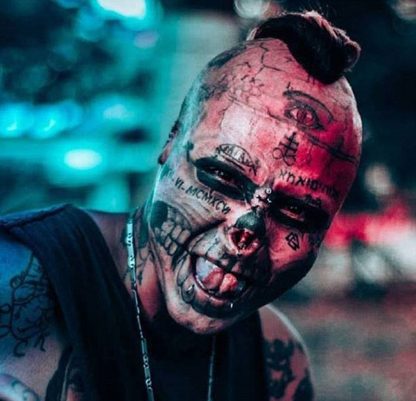 据悉,这名男子名叫卡拉卡•斯考尔(Kalaca Skull),原名艾瑞克•耶尼尔•辛卡培•拉米雷(Eric Yeiner Hincapié Ramírez),现年22岁,是一名纹身艺术家。他为了成为“活骷髅”可谓煞费苦心。他割去了鼻尖和大部分耳垂并分舌,又用纹身的方法把分舌画成灰蓝色,把眼窝纹成大面积的黑色,上颌与下颌绘上牙齿,涂上浓重油墨。他还剃成了飞机头,以展示头部纹身。