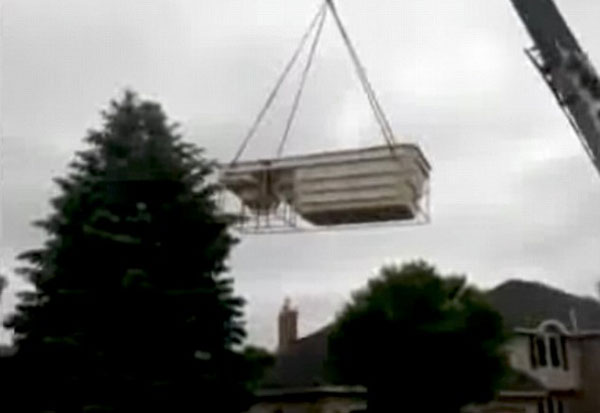 据悉,当时美国明尼苏达州的一位房主请来起重机操作员将他的运动水池(热水浴缸)放入屋内。他已挖好了洞,起重机操作员将水池拖至住宅上方,准备送进洞口,就在这时,灾难蓦然降临。起重机由于承受不住水池的重量,轰然倾翻在车库前,吊臂砸中屋顶,压坏了烟囱和一部分房体。房主在废墟前大吼。