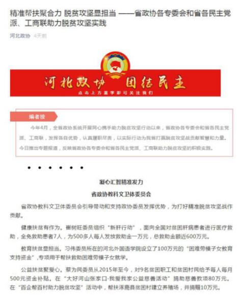 近日,河北省政协公众号发表文章《精准帮扶聚合力 脱贫攻坚显担当——省政协各专委会和省各民主党派、工商联助力脱贫攻坚实践》。文中,由崔树旺委员发起并长期开展的贫困肝病患者救助活动——新肝行动,作为科教文卫体委员会脱贫攻坚工作成绩被着重肯定。这是河北省政协对新肝行动的重大肯定和鼓励,是社会对新肝行动的又一次认可,同时为新肝行动今后的救助工作注入了更多信心和力量。