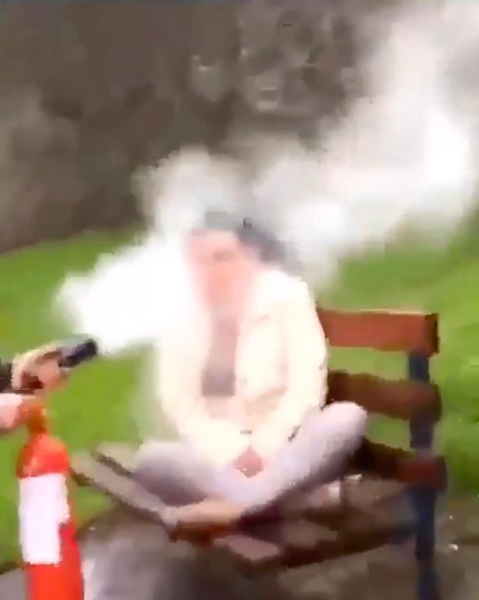 【环球网综合报道】据英国《镜报》9月6日报道,近日,一段令人发指的视频在网上疯传。在公园内,几个年轻混混不怀好意地接近一名在长椅上盘坐打盹的女子,其中一个拿着灭火器,竟然直接就对着女子的脸喷,同伙们嬉笑不已,还丧心病狂地录下视频。