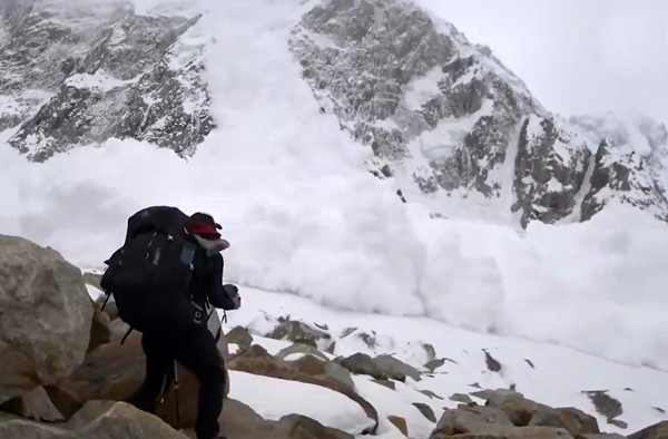 52岁的Paco意识到积雪正冲向他们的时候,已经来不及逃走了,他们只能躲在就近的岩石缝隙里,来躲避这场“灾难”。厚厚的积雪夹杂着部分石块从山上滑下来,白色的雾气在几秒钟内就已经漫天笼罩。工作人员头发、胡须、衣服等也瞬间沾满了积雪。制作团队的摄像机记录下了这凶险的一幕。