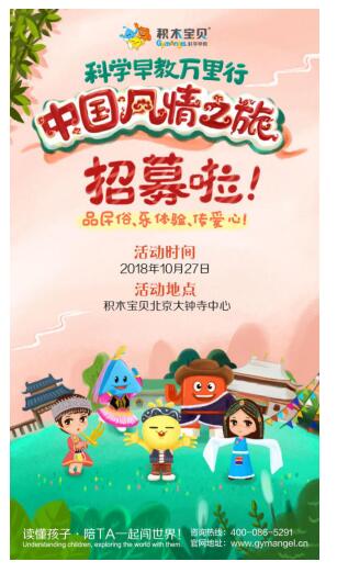 2018年10月27日,将会在北京大钟寺,举办科学早教万里行的公益捐赠活动,本场活动的主题是“中国风情之旅”。中国有56个民族,其中55个是少数民族。绚丽的服装、古老的传说,特色的美食……无不让人对少数民族充满好奇与向往。可大多数少数民族都地处偏远,想过去一趟很不容易。积木宝贝让您不必远行,就能畅享一次中国风情之旅!