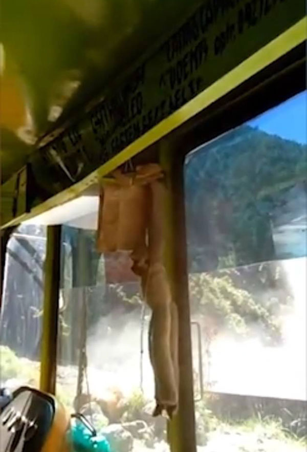 事件发生时,司机正驶入弯道,他听到了隆隆的声音。一开始,司机将车向后退了几英尺,以为已经躲过一劫。然而随着山体滑坡愈演愈烈,他意识到他们仍不安全,于是他疯狂地试图倒车。但由于后方还有其他车辆,他无法倒车。此时,山坡上的树木开始倒塌,巨石也开始移位,乘客们惊声尖叫。其中一块石头掉到车顶上,在驾驶员座位上方砸出一个凹痕。所幸,在此次事件中无人受伤。