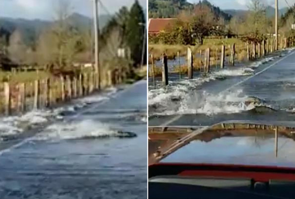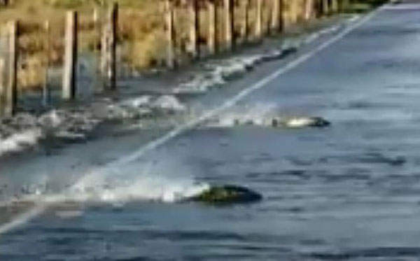 【环球网综合报道】据英国《每日邮报》11月6日报道,11月4日,一场暴雨导致许多鲑鱼游上美国华盛顿州斯科科米什河(Skokomish River)附近一条被洪水淹没的高速公路,当汽车驶近时,司机在几英寸深的水中,发现这些鲑鱼正在奋力地逆流而上。