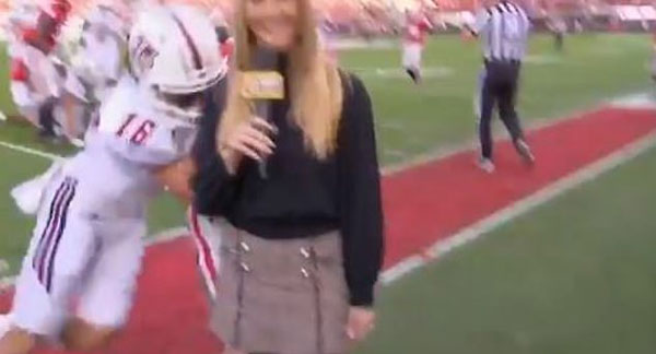 【环球网综合报道】据英国《每日邮报》11月22日报道,近日,一名美国娱乐与体育节目电视网(ESPN)的女主持人在报道一场大学橄榄球比赛时突然被一名运动员撞倒。事后,这名运动员在网上向她道歉并请求和她约会。