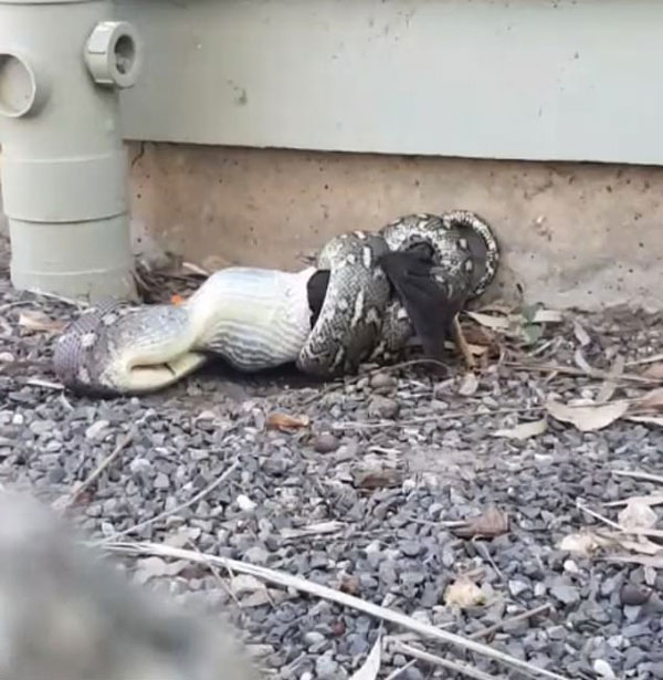 【环球网综合报道】据英国《每日邮报》11月25日报道,11月21日,澳大利亚女士邦妮•卓别林在她家院子发现一条蟒蛇正缓缓缠绕着一只蝙蝠,并花了一上午的时间最终将猎物“收入囊中”。她将这一惊悚的发现用视频记录了下来。