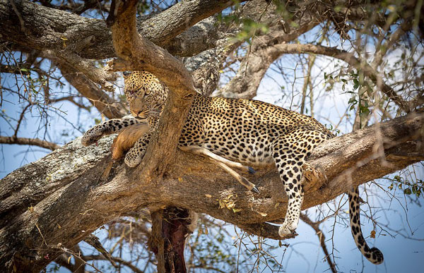 【环球网综合报道】据英国《每日邮报》12月9日报道,日前,49岁的摄影师霍格尔•W•格劳尔(Holger W Grauel)在坦桑尼亚塔伦吉尔(Tarangire)国家公园拍摄到一只独眼花豹卧在树杈上,舔着嘴唇自豪地展示着它的猎物。尽管眼睛少了一只,但它的伤势似乎并没有影响到它的狩猎技能,它还是成功地捕获了一只羚羊。