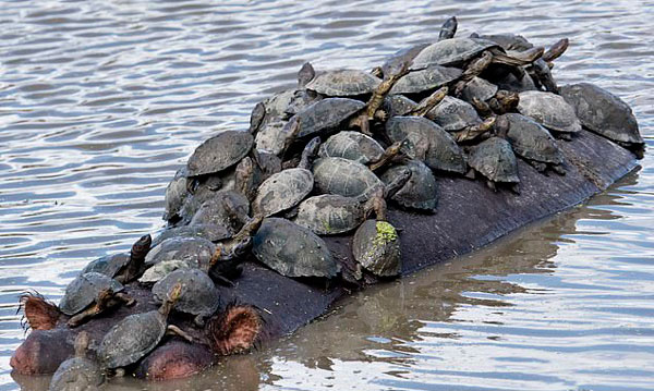 西蒙表示,拍摄这组照片时,自己与河马、乌龟之间的距离非常近,但是它们并未受到影响,再加上乌龟的数量之多,所以西蒙认为这组照片非常特别。