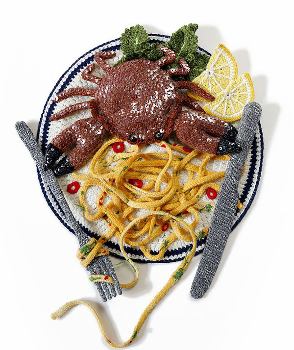 这名艺术家名叫凯特•詹金斯(Kate Jenkins),来自英国南威尔士地区,是一名从业20多年的针织品艺术家,今年47岁。她,编织的作品以圣诞豪华菜单为主题,各种美食琳琅满目,吸人眼球。从配有十分逼真的火鸡翅膀的圣诞烤肉到由龙虾、鸡蛋和鱼片组成的海鲜花圈,各种美食目不暇接,令人看不过瘾。