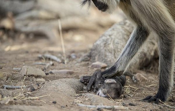 据报道,来自印度新德里的摄影师阿克纳•辛格捕捉到了这一令人心碎的时刻。最初这只母叶猴坐在一棵树上,怀里抱着仅出生两天的婴猴。母猴试图鼓励这只出小叶猴进食,并与其它叶猴互动,但没有成功。当另一只猴子跳到树上,摸着婴猴的脸时,它没有任何反应,这只猴子温柔地拥抱这只心烦意乱的母猴。后来,母猴抱着孩子不停转圈,确保它一直贴近自己。它拍了拍孩子的背,但后者只是在它的怀里无力地扑腾几下。最终,这只母猴从树枝上跳下来,怀里还抱着婴猴,朝一个空旷的地方走去。它让婴猴躺在地上,一直在旁边看守着它,悲伤又绝望。
