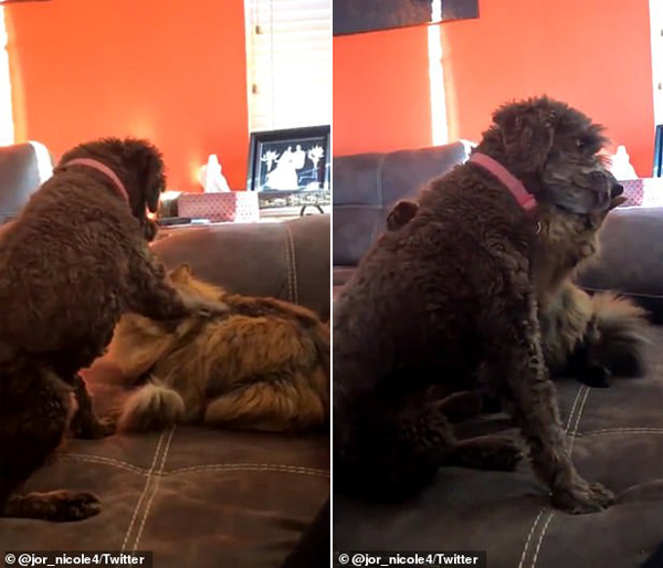 据悉,这名网友是来自美国科罗拉多州的乔丹•艾尔兰得(Jordan Ireland),今年21岁,就读于康斯威星州的一所大学。乔丹养了两只宠物,其中狗狗的名字叫麦琪(Maggi),猫咪取名叫小南瓜(Pumpkin)。视频中,小南瓜正舒舒服服地躺在沙发上,背后的麦琪伸出了毛茸茸的爪子,轻轻地抚摸了小南瓜的背部。小南瓜随即坐起,转过来把一只爪子搭在了麦琪的背上,似乎想给它一个暖暖的拥抱。从画面中看,小南瓜和麦琪还把这个拥抱的动作保持了好几秒,仿佛沉浸其中,十分享受。